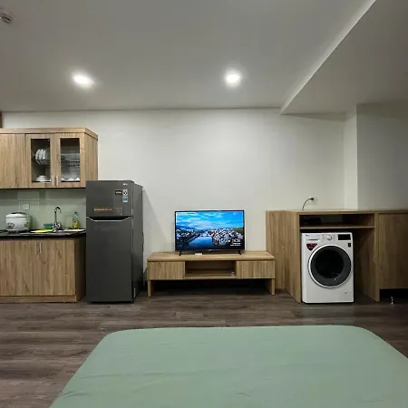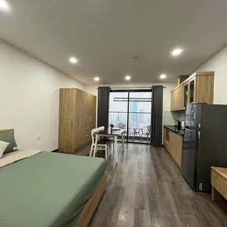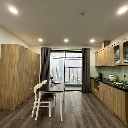 Een ingerichte keuken met een waterkoker, een koelkast en keukengerei is beschikbaar als onderdeel van de zelfvoorzienende voorzieningen van de accommodatie. TTTM BigC Thang Long - Tuyen 145 bushalte is vrij dicht bij 1-slaapkamer Dcapital 1 Bed Apt Near National Convention Center gesitueerd.